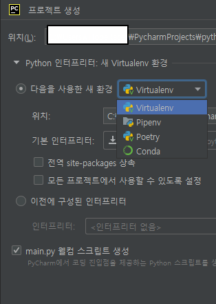 2. 프로젝트를 생성할 때 새 환경을 선택해야 한다. (다음 4가지)