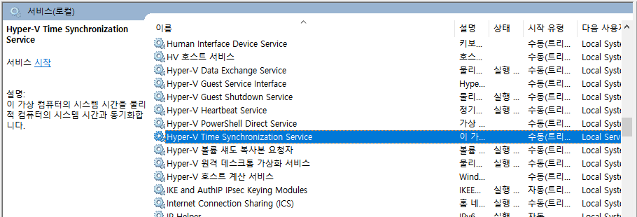 1. Hyper-V Time Synchronization Service 서비스 중지 - 필수