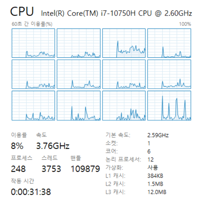 - 시간, CPU 사용률 0~11, Total CPU 사용률 (총 14개 정보가 표시)