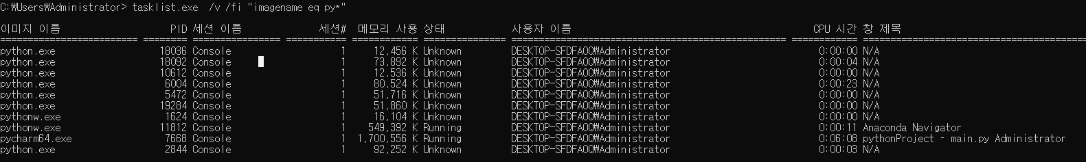 - tasklist.exe /v /fi "imagename eq py*"