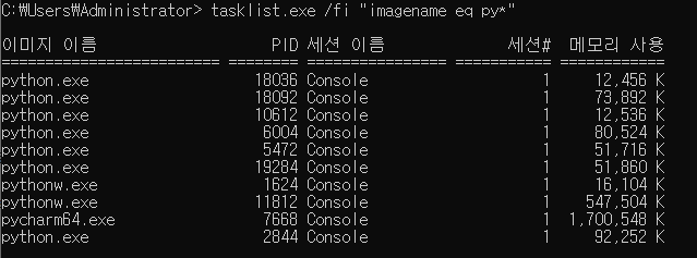- tasklist.exe /fi "imagename eq py*"