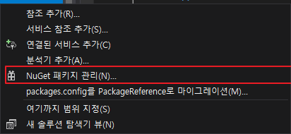 1. 프로젝트 - 참조 - 오른쪽 마우스 - NuGet 패키지 관리
